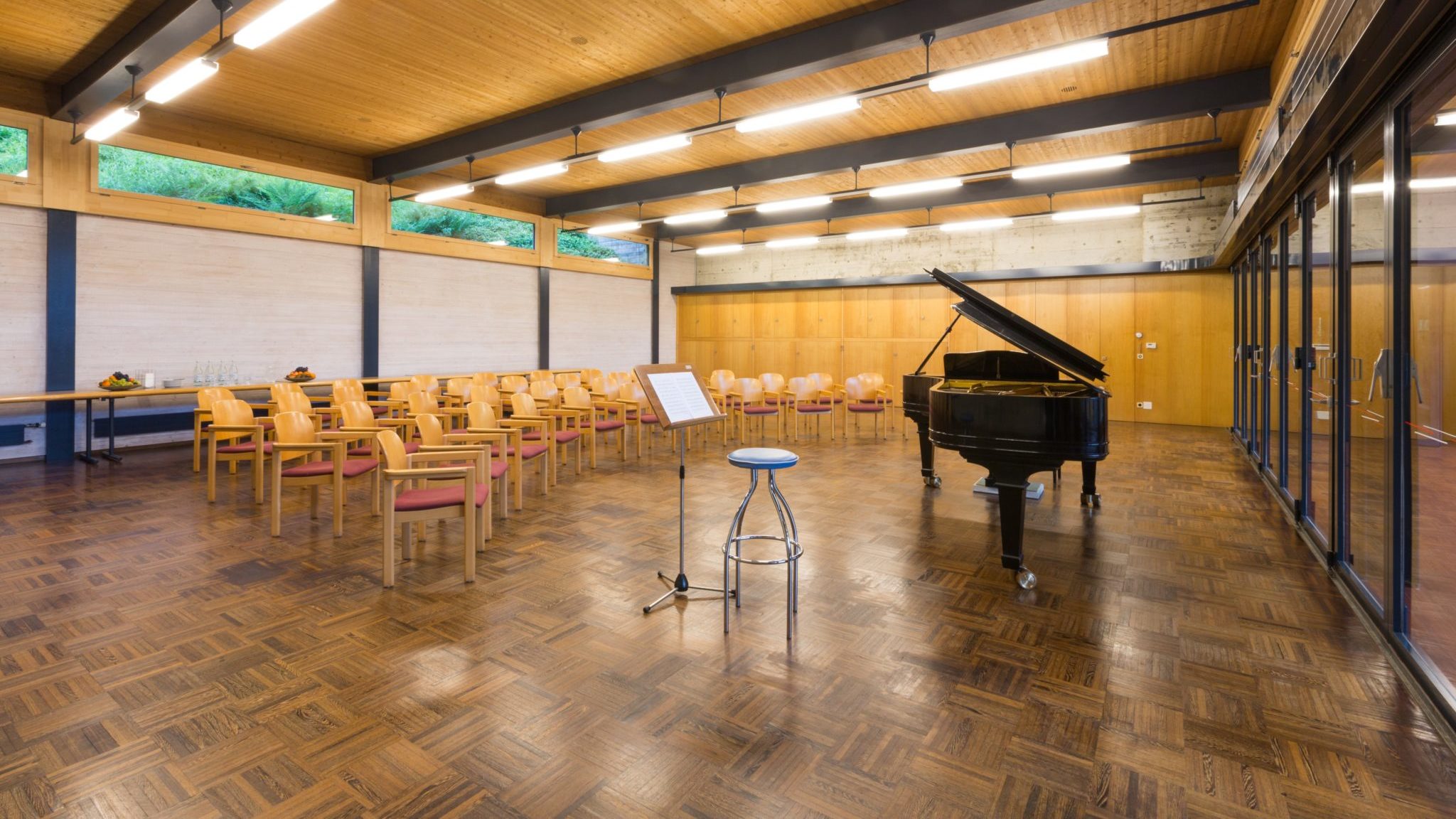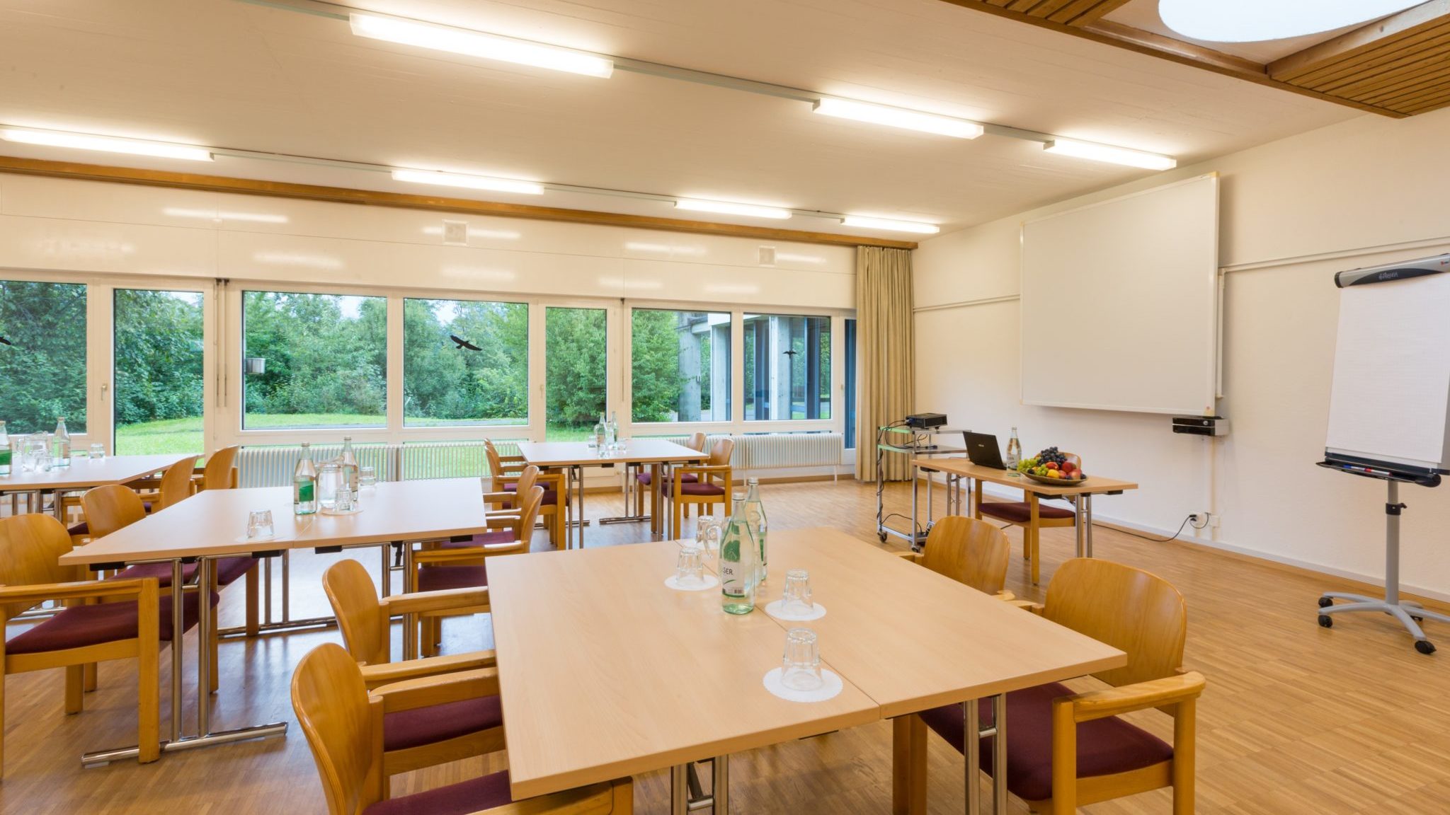Die meisten der hellen, schlichten und grosszügigen Seminarräume haben direkten Zugang ins Freie. Das Hotel kann 180 Gäste verköstigen und 100 Gäste beherbergen, in Zimmern verschiedener Standards.
